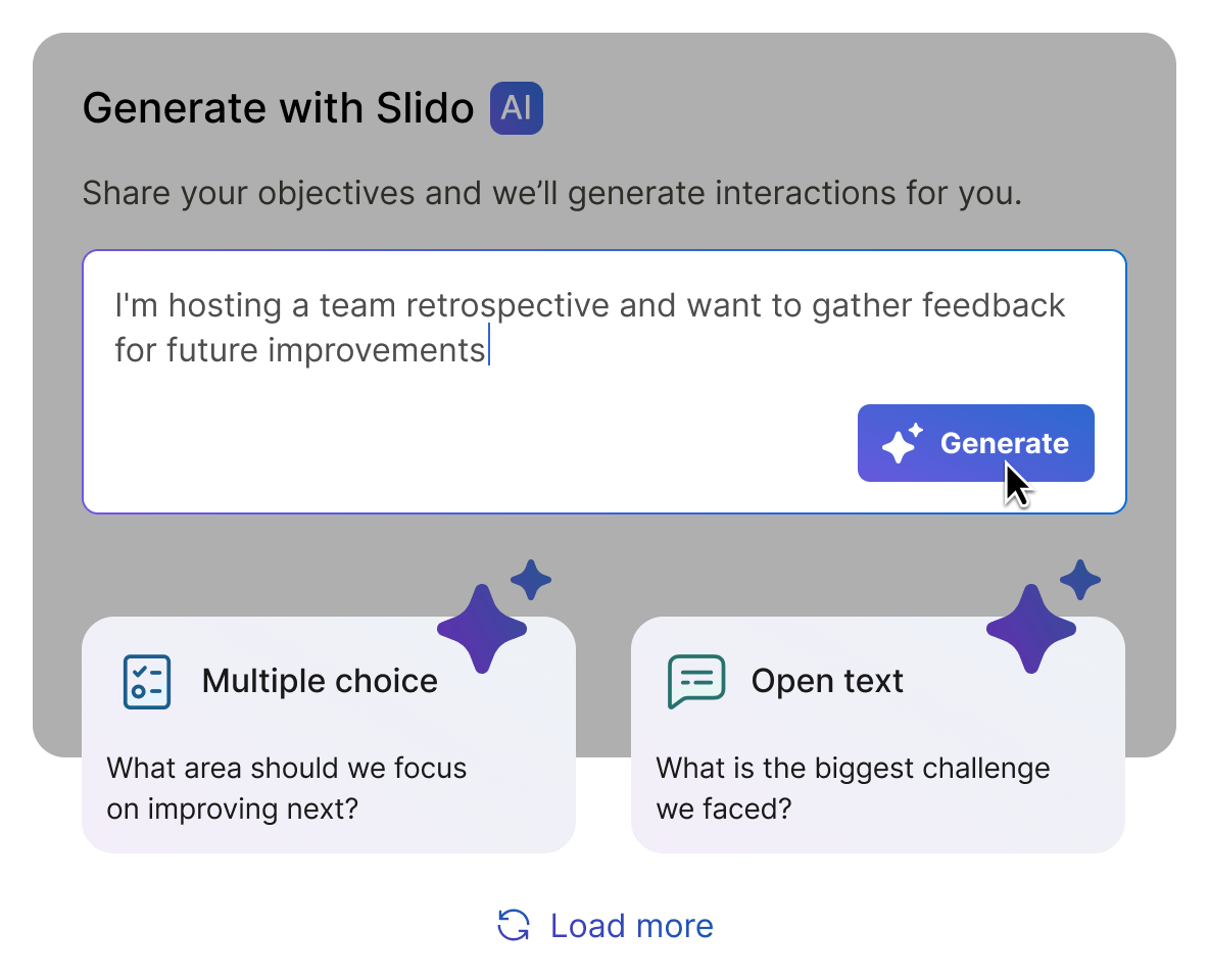 Share your meeting goal, audience size and use case to get tailored polls in seconds. Spend less time preparing and get new ideas for engaging your audience.