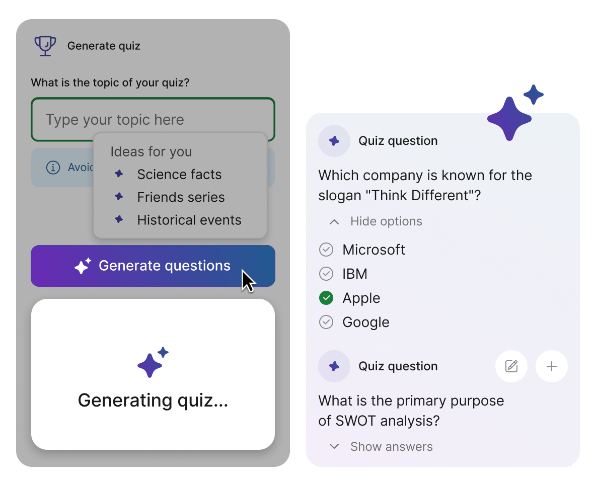 Build a quiz in just a few clicks. Enter your own topic or choose a suggested one, then generate questions and pick the ones you want to include in your presentation.