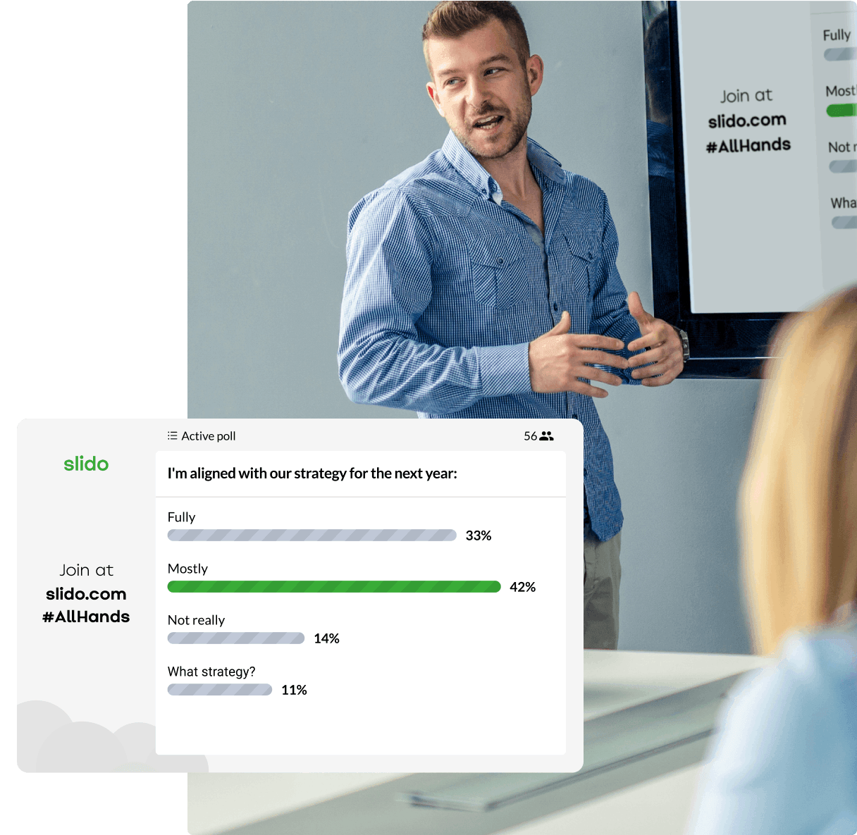 Forget one-way presentations and inefficient Q&A. Slido lets you engage everyone with live Q&A and polls and find out what’s on their minds in seconds.